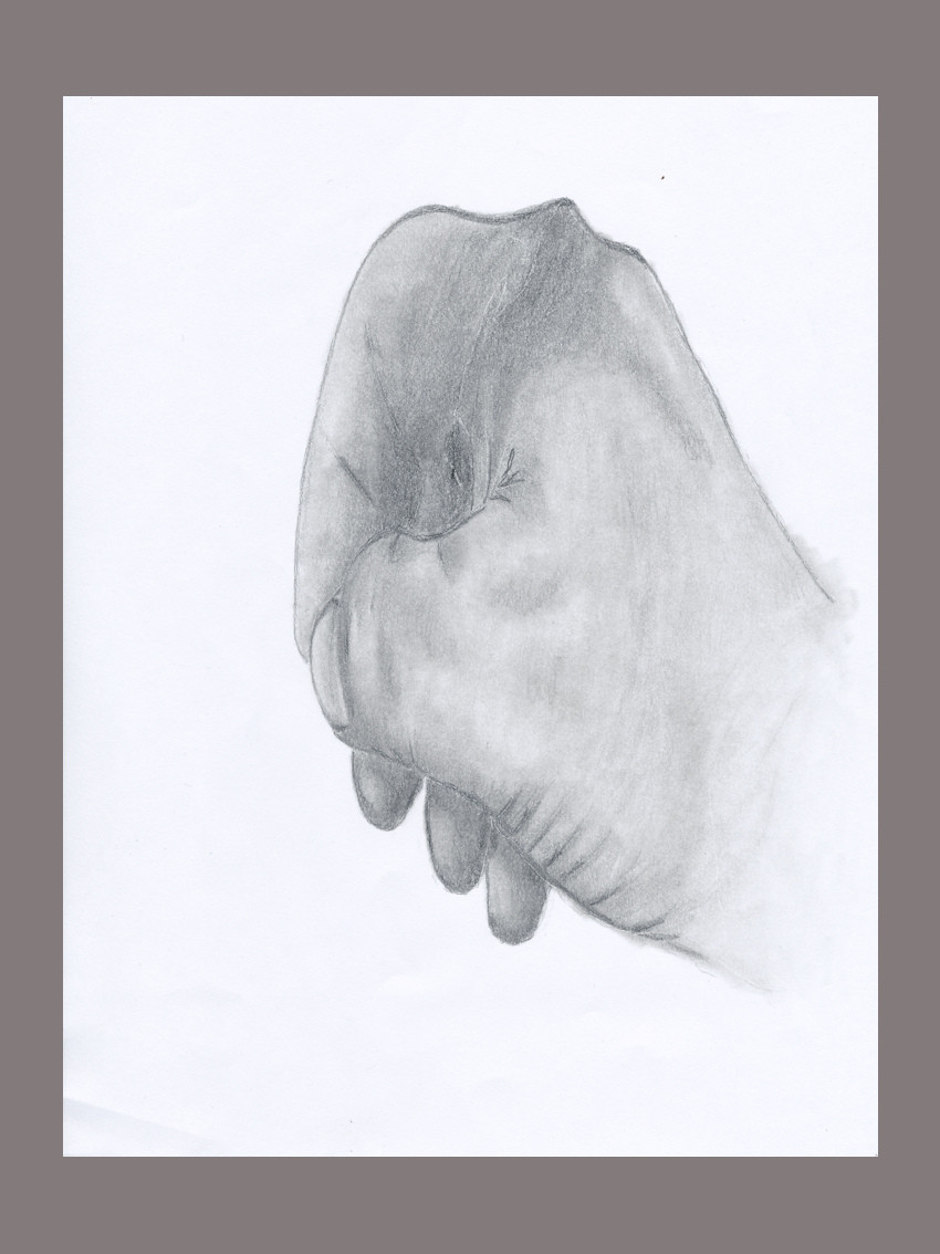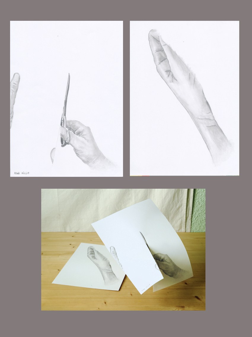 Daher ist die Hand in gestreckter Form gezeichnet. In der Fotografie erscheint das Blatt Papier kürzer und die gezeichnete Hand ganz normal.
