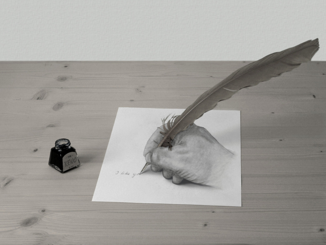 Ausgangspunkt für dieses Motiv sind M. C. Eschers zwei Hände die sich selbst zeichnen. Für mich stand die Frage: Wie wirkt es, wenn ein tatsächlicher Stift in der Hand ist? Ein Stift wirkte im ersten Test mickrig. Eine Feder ist viel wirkungsvoller. Der 3d Effekt kommt damit auch ausdrucksstark zur Geltung.