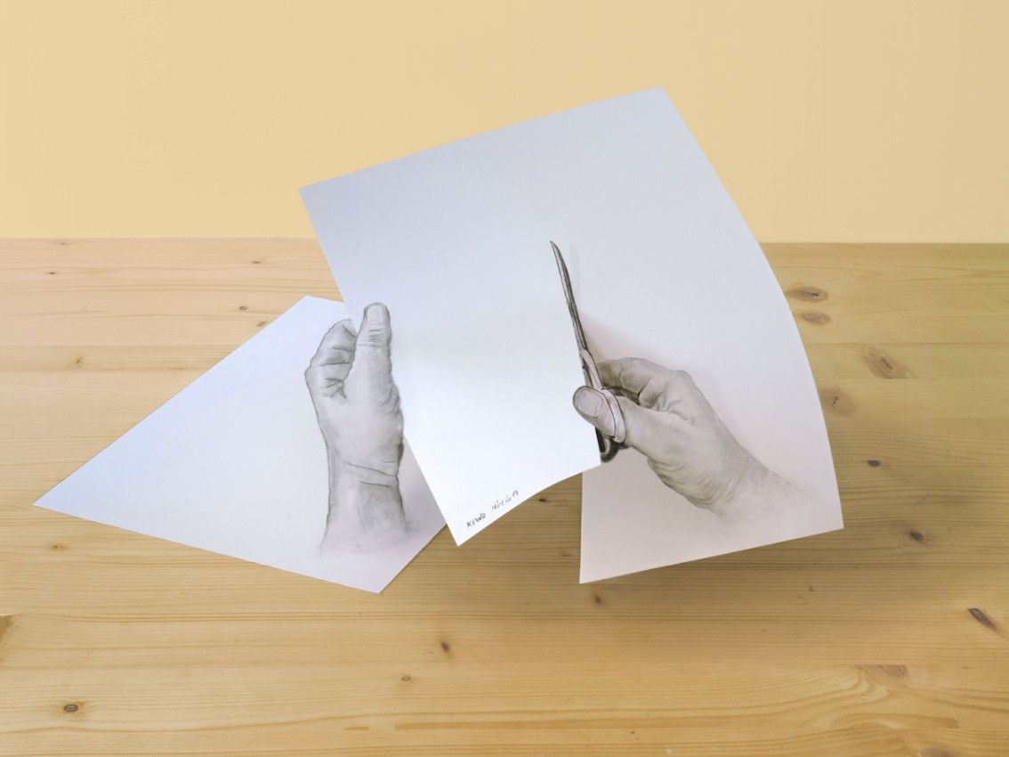In der Zeichnung ist das Greifen des Papieres im wahrsten Sinne des Wortes ein genialer Kunstgriff.