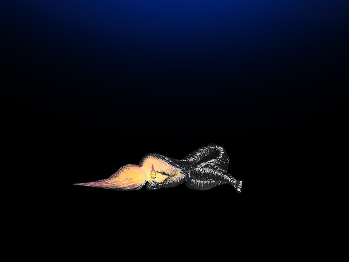 In dieser Arbeit wurde eine Zeichnung digital ausgeschnitten und vor dem dunklen Hintergrund platziert.
