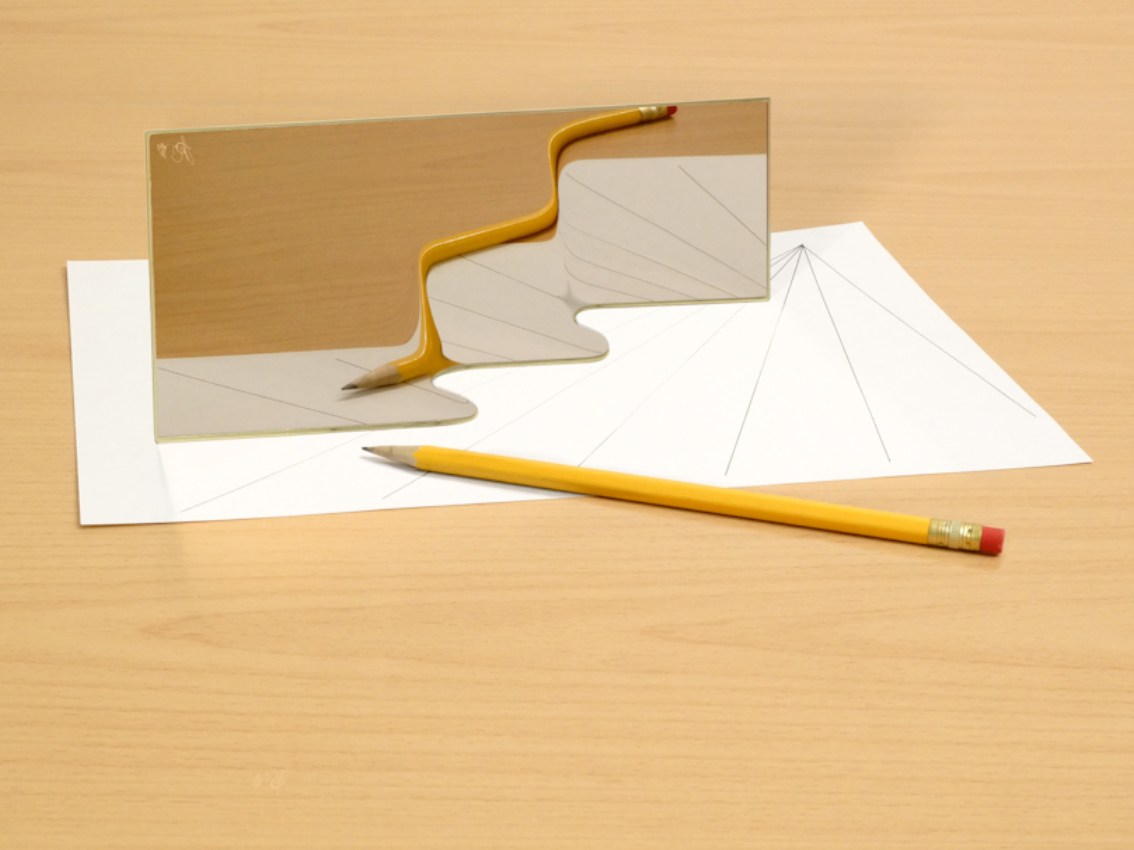 Für die Hand ist diese anamorphose Zeichnung geschaffen. Anamorphos (Hier Längenanamorphose) bedeutet, daß ein Bild nur von einem bestimmten Punkt aus richtig gesehen wird. Der Standort der Kamera ist dieser bestimmte Punkt.